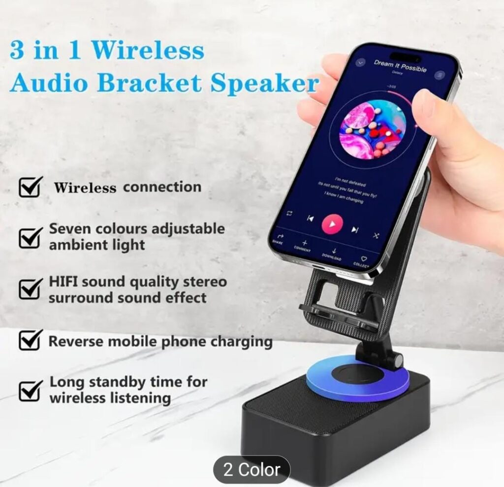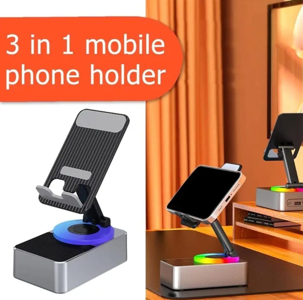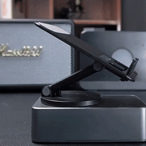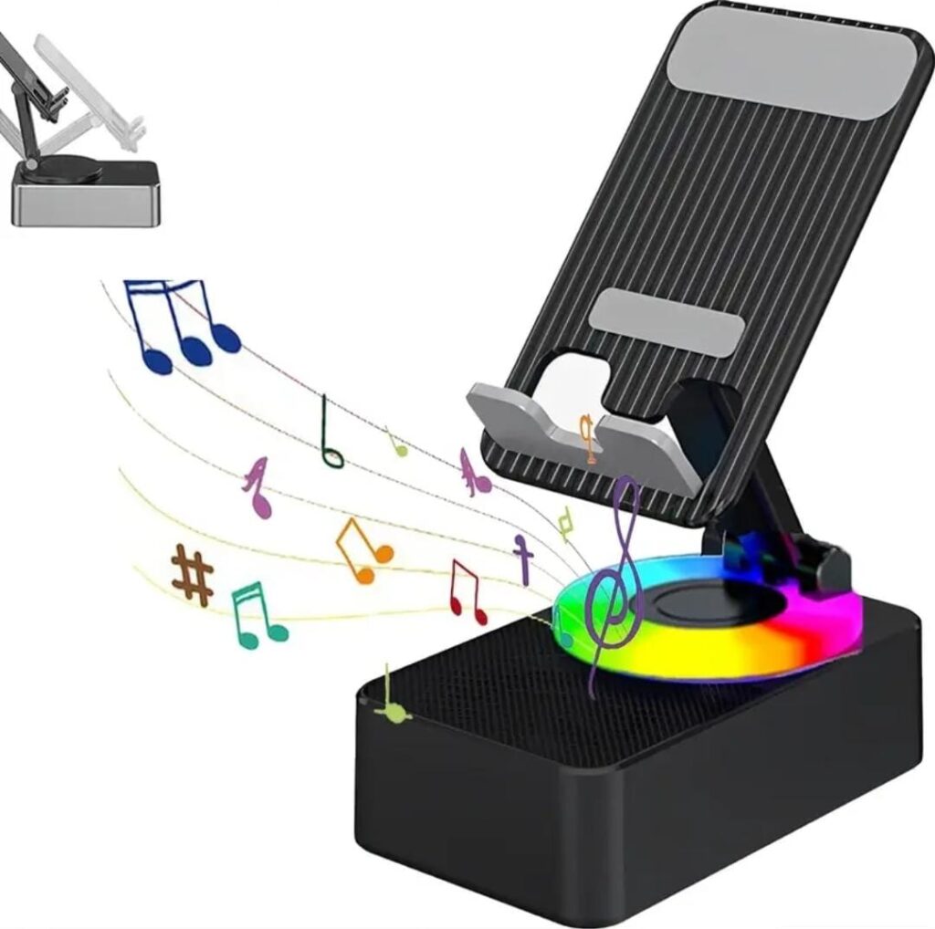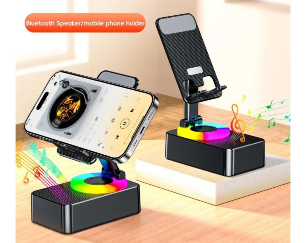 INTRODUCING THE KANIMART PHONE STAND WITH BLUETOOTH SPEAKER THE SIMPLE YET BUT POWERFUL SOLUTION TO ELEVATE YOUR DEVICE EXPERIENCE. FOLDABLE,ADJUSTABLE AND COMPACT,THIS STAND OFFERS THE FLEXIBILITY YOU NEED FOR ANY SCENARIO. WHETHER YOU ARE GAMING, COOKING, OR SIMPLY SCROLLING, IT IS DESIGNED TO MAKE YOUR LIFE EASIER.